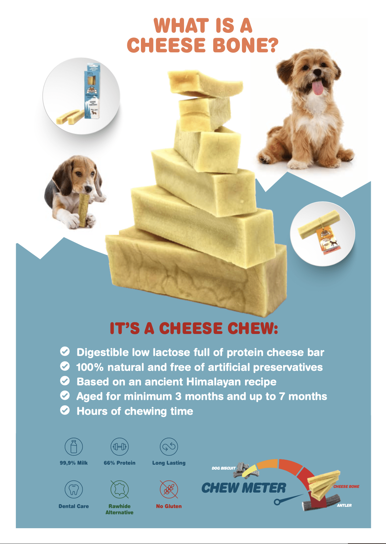 Un Cheese bone est un fromage à mâcher pour chien 100% naturel, sans conservateur, réduit en lactose, ayant une structure très dense et produit selon une recette centenaire de la région de l’Himalaya au Népal.